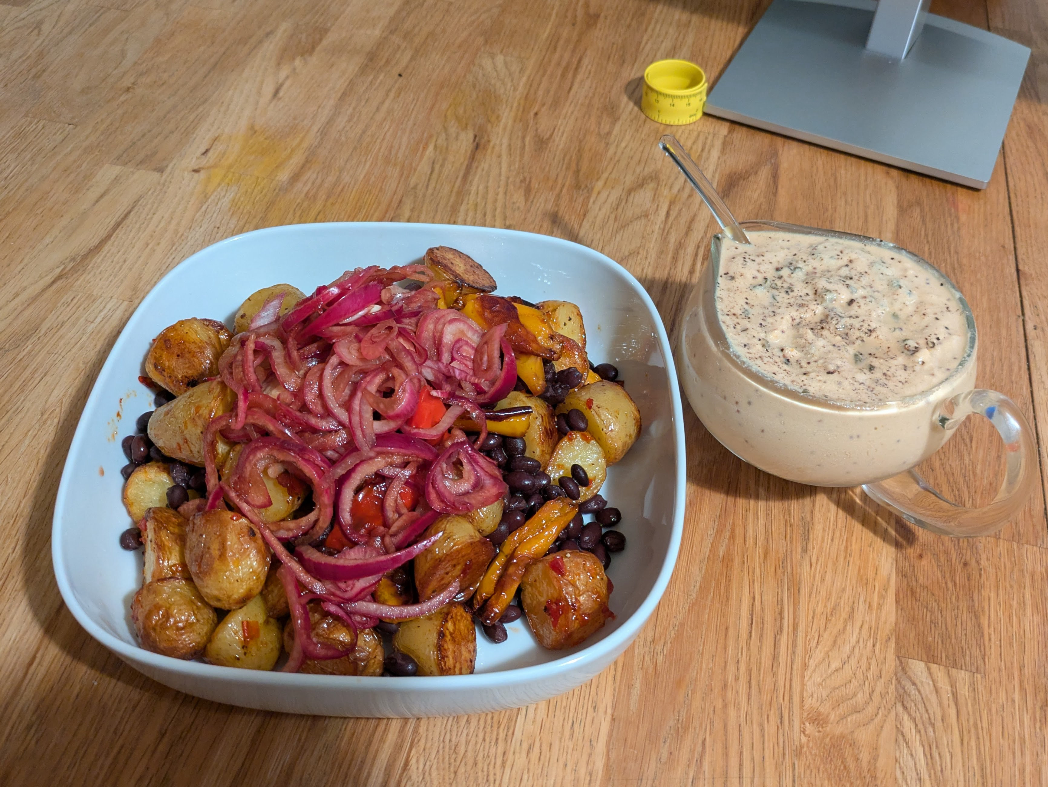 I made a dinner on Sunday, and as the wife points out I do like to go on about it on the rare occasions it happens. I made this delicious dinner, sticky potato and pepper salad with a weird "dip" made mostly of tofu. And yes, salad, it is mostly a plate of roast potatoes, you're right, and we should have had some proper salad with this salad. The others had chicken with it and I had southern fried grills. I would do it again, in fact I probably have to to use up some of the ingredients I bought specially for it like the chilli jam.