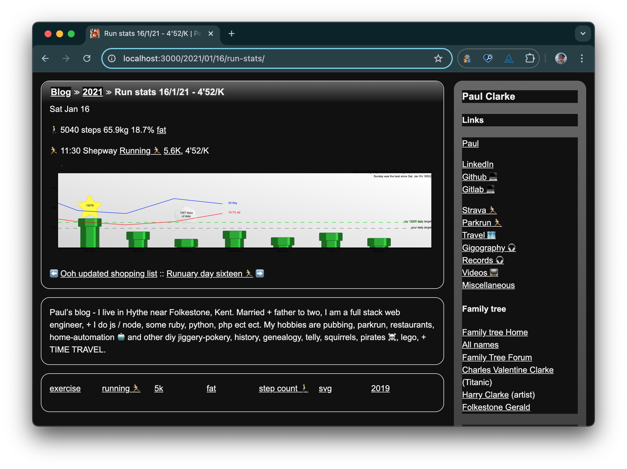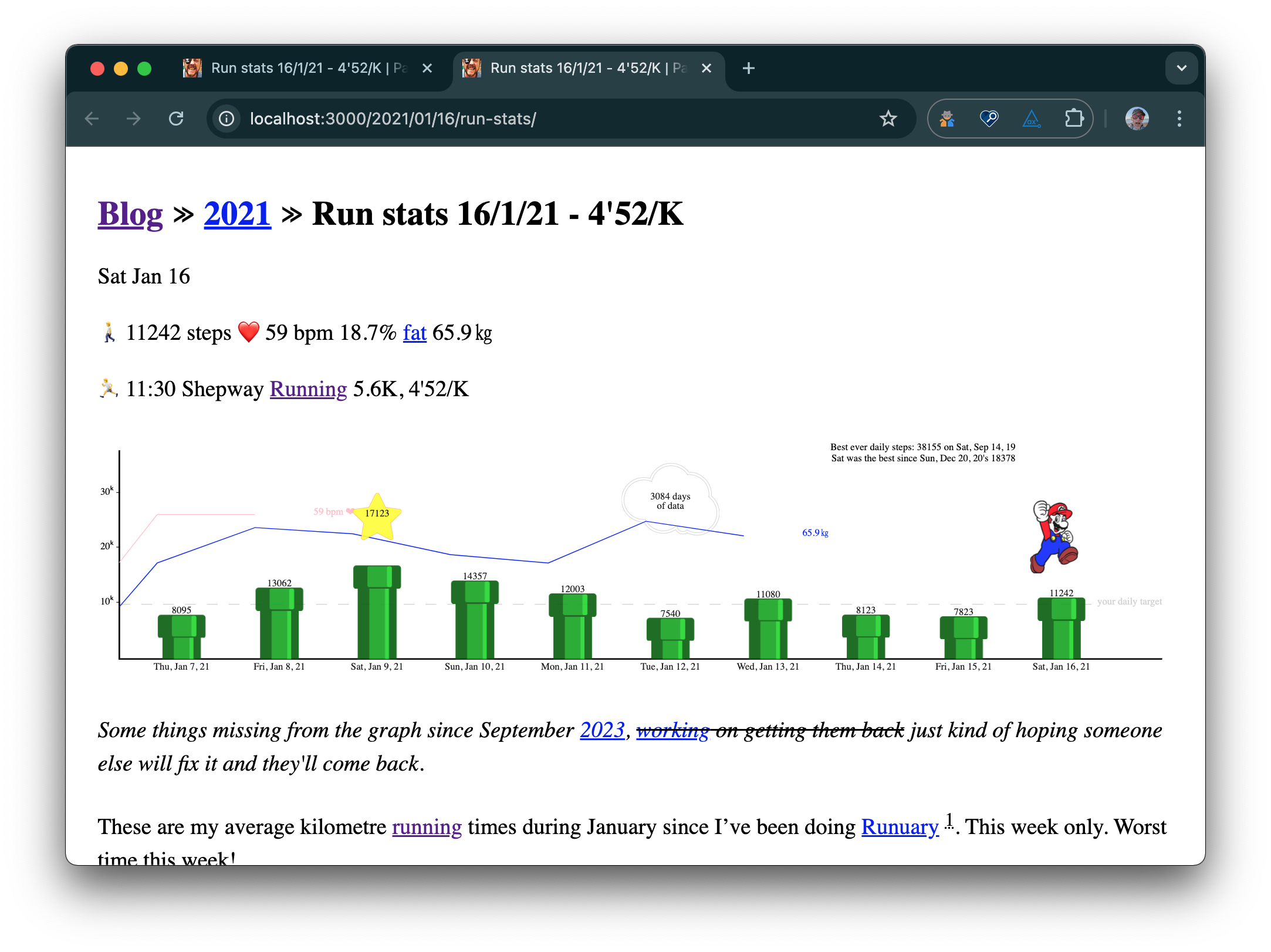 Still doing more ongoing clean up of old run stats pages. I'm recovering lots of old step count by the looks, where pages were generated in 2020 and 2021 before the full count was in. By rebuilding the pages they now have the full step count, the "modern" lack of styling and the up to date Super Mario graphs on Saturdays. So for example Saturday January 16th 2021 did look like this: