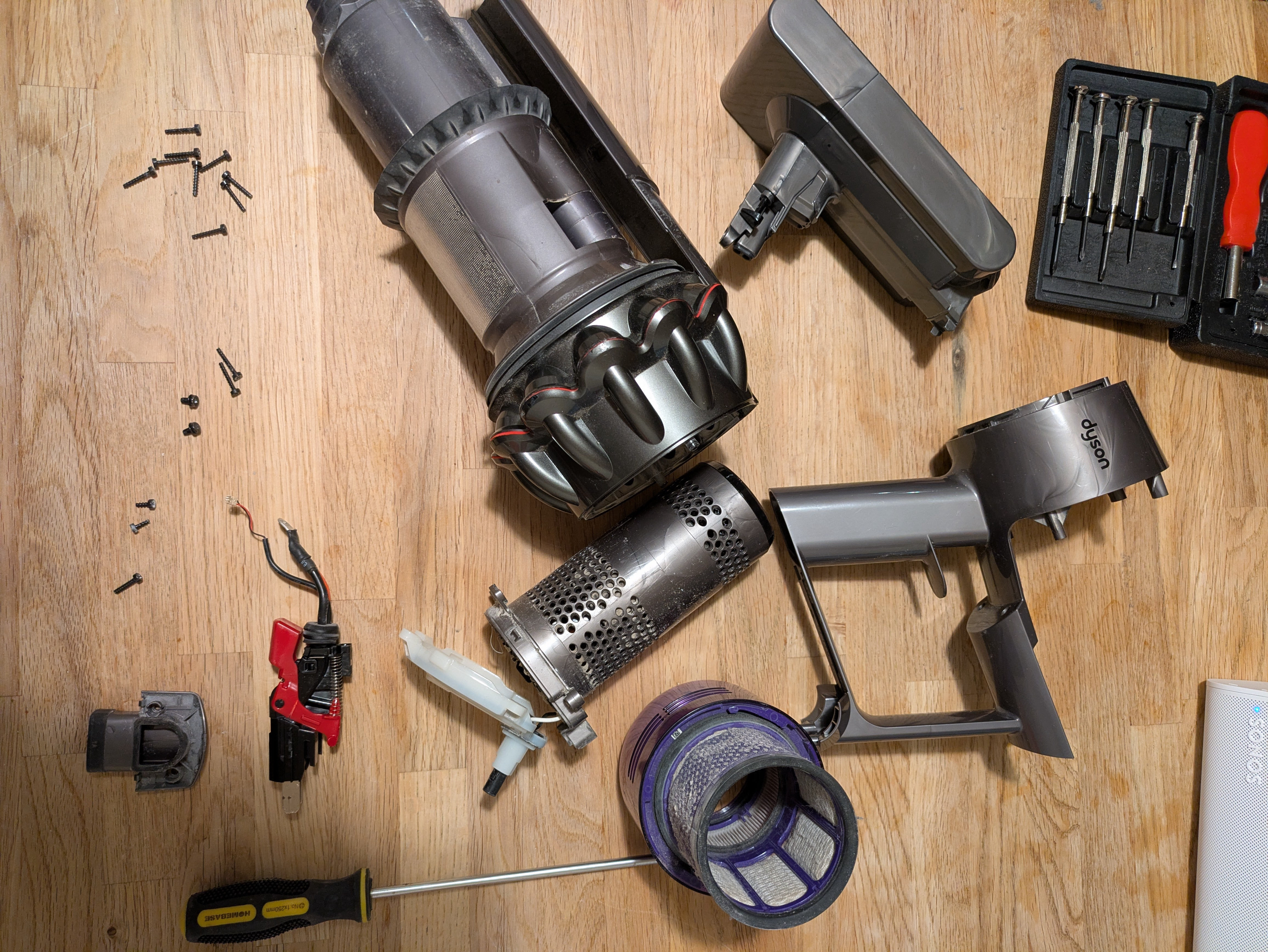 Dyson vacuum is broken. Switch is stuck. Search online, seems to be a common problem, a design fault. Luckily lots of people have had the same problem! I can get a replacement, but I might be able to fix it without that. Ultimately it's going to need the replacement switch though, and then probably a replacement vacuum cleaner. The replacement is not going to be a Dyson.