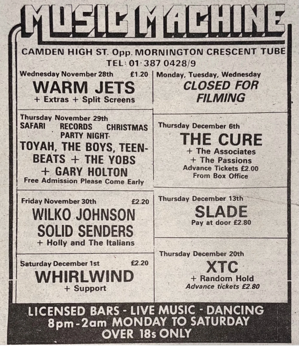 The Cure played here in 1979 when it was known as The Music Machine. Support from The Associates and The Passions.