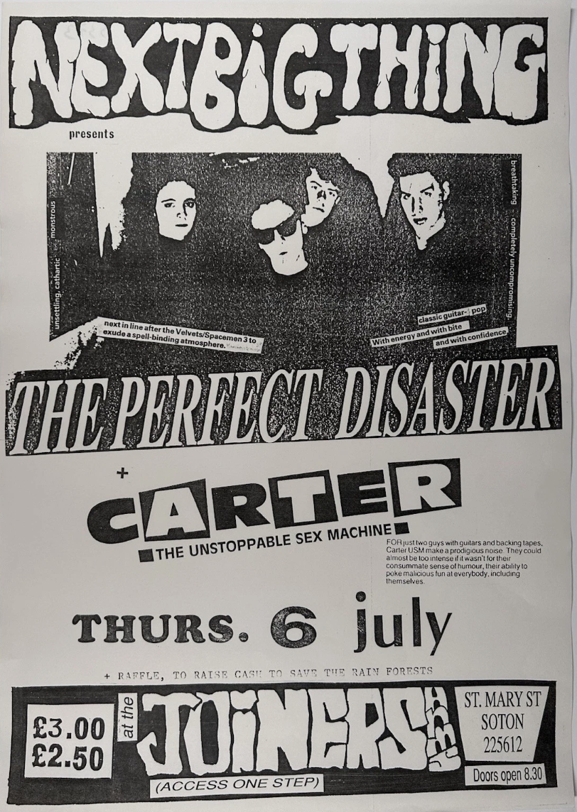 Found another Southampton Joiners poster on ebay, for Carter USM supporting The Perfect Disaster. It says 1988 but it also says Thursday 6th of July which would be 1989... so either it's not only me who mixes up the dates on all their gig history, or something happened to the calendars between now and then. Possibly the millenium bug.