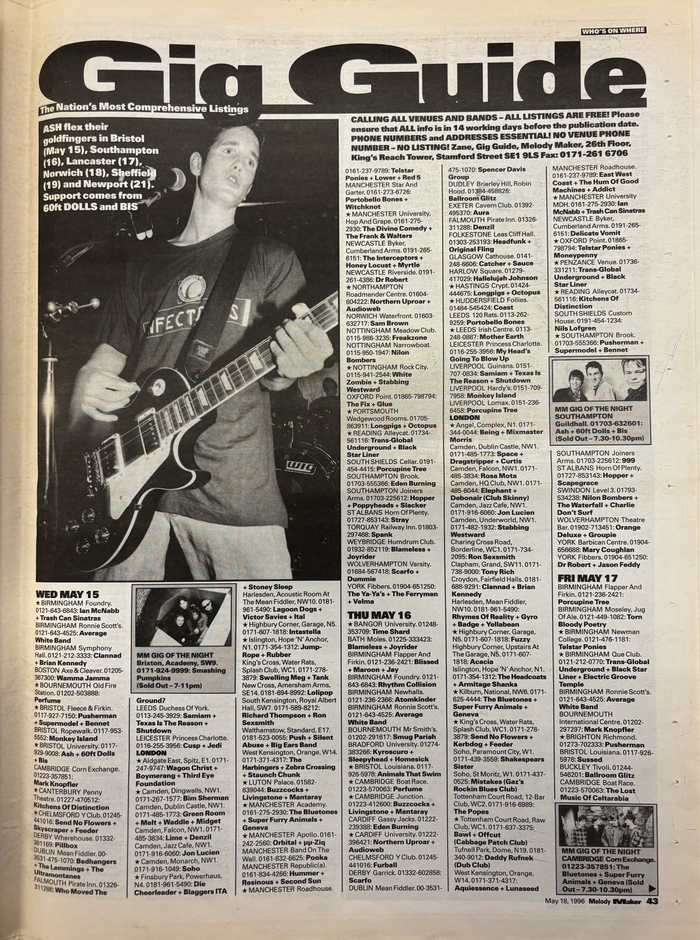 Other gigs at Southampton Guildhall include Suede (1996), Ocean Colour Scene ('96), dodgy ('96), Manic Street Preachers (1996), Echobelly (1996), The Wildhearts (1995), and D:Ream (1995).