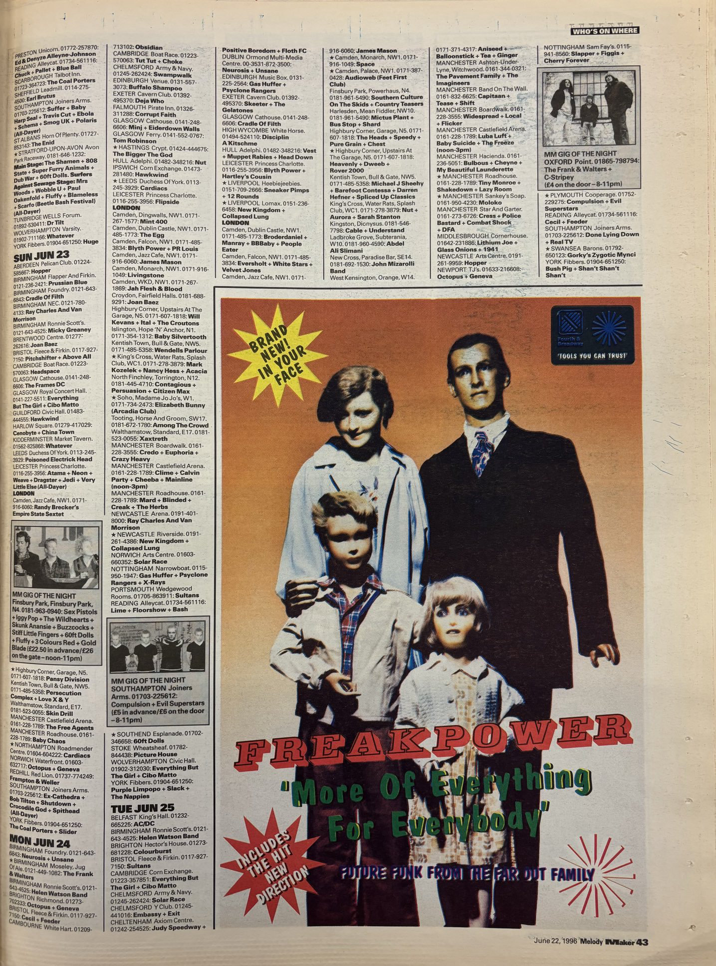 Gigs at Portsmouth Wedgewood Rooms I attended are Southsea Fest ('11), David Devant And His Spirit Wife ('97), Eddi Reader (1996), Super Furry Animals (1996), Sam Brown (1996), Maker Shaker 3 (1996), Minty ('96), 60ft Dolls (1996), Northern Uproar ('96), Vent ('96), Dubstar ('96), Sultans of Ping (1996), Boss Hogg ('96), Red Snapper ('96), Something ('96), Chumbawamba ('95), Maker Shaker tour (1995), Thurman ('95), The Bluetones (1995), Stereolab ('95), Black Grape (1995), Heavy Stereo (1995), Stereolab ('95), Marion (1995), Freak Power (1994), Sultans of Ping ('94), Dodgy (1994), Salad ('94), The Farm ('94), Ed Tudor-Pole ('94), Sean Meo (1994), Annie Hates Cordial ('94), Oasis ('94), Toyah ('94), Cabaret (1994), Gunshot ('94), Elastica (1994), Sultans of Ping ('94), Cabaret with Sam Brown ('94), Annie Hates Cordial (1993), Dogs D'Amour ('93), Firework Party ('93), Little Angels ('93), Amazing Windmills (1993), Molly Half Head ('93), + Sean Hughes ('92).